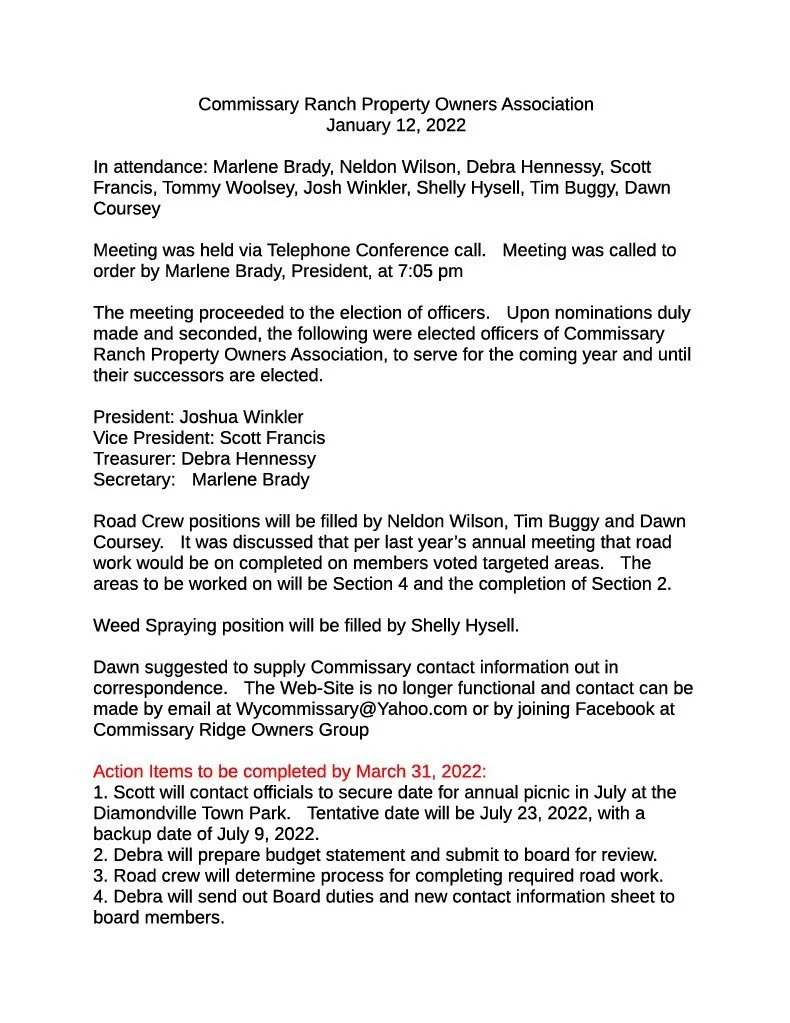 2022 COMMISSARY RANCH BOARD MEETING MINUTES JANUARY 12TH, 2022 - MEETING MINUTES MARCH 16TH, 2022 - MEETING MINUTES APRIL 27TH, 2022 - MEETING MINUTES MAY 11TH, 2022 - MEETING MINUTES JULY 23RD, 2022 - MEETING MINUTES JULY 23RD, 2022 - MEETING MINUTES