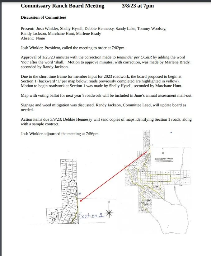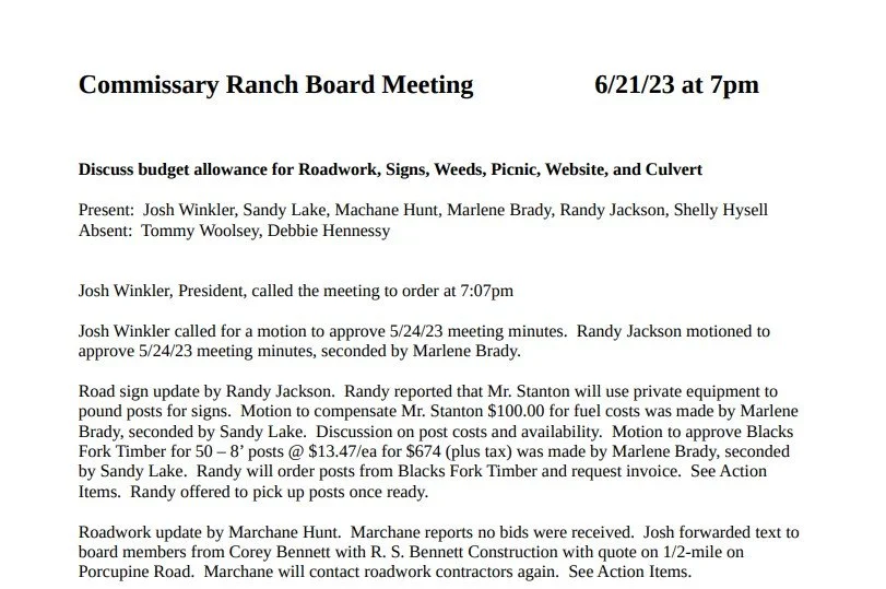 2023 COMMISSARY RANCH BOARD MEETING MINUTES JANUARY 25TH, 2023 - MEETING MINUTES MARCH 8TH, 2023 - MEETING MINUTES MAY 24, 2023 - MEETING MINUTES JUNE 21, 2023 - MEETING MINUTES JULY 29TH, 2023 - MEETING MINUTES AUGUST 29TH, 2023 - MEETING MINUTES SEPTEMBER 16TH, 2023 - MEETING MINUTES