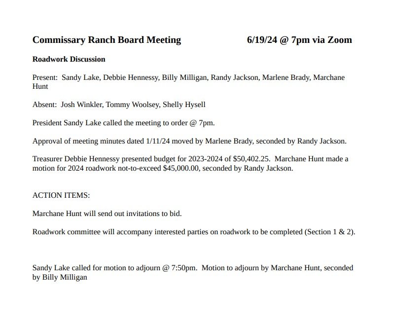 2024 COMMISSARY RANCH BOARD MEETING MINUTES September 21st, 2024 - Meeting Minutes August 1st, 2024 Meeting Minutes July 13th, 2024 Meeting Minutes June 19th, 2024 Meeting Minutes January 11th, 2024 Meeting Minutes